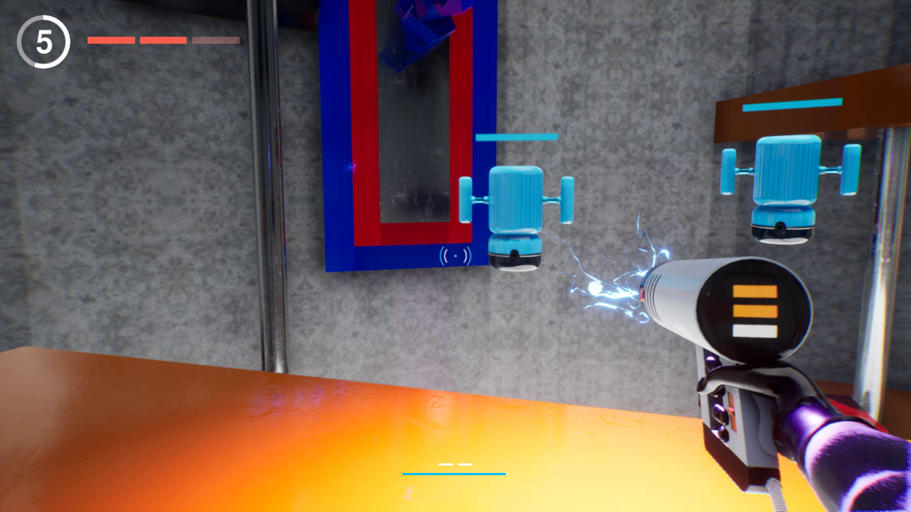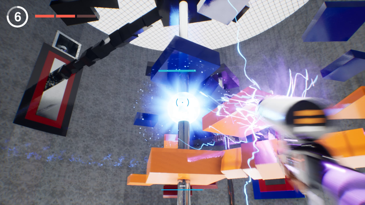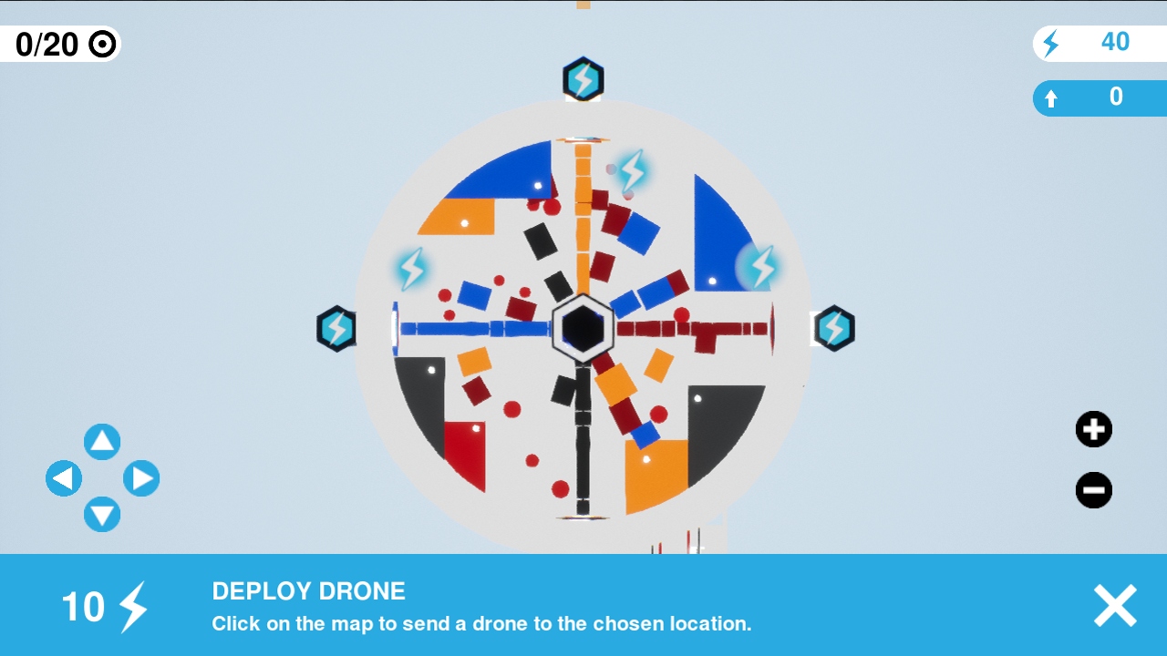 The first-person player tries to destroy four generators in the level to eventually turn off the mainframe structure. At the same time, the defending player strategizes on their mobile phone, looking at the same level from a top-down perspective, placing and upgrading drones in the level and protecting their generators to protect their core.