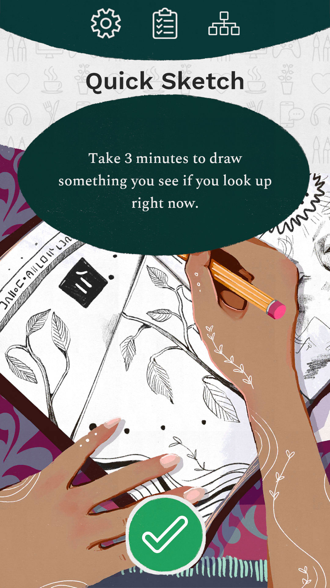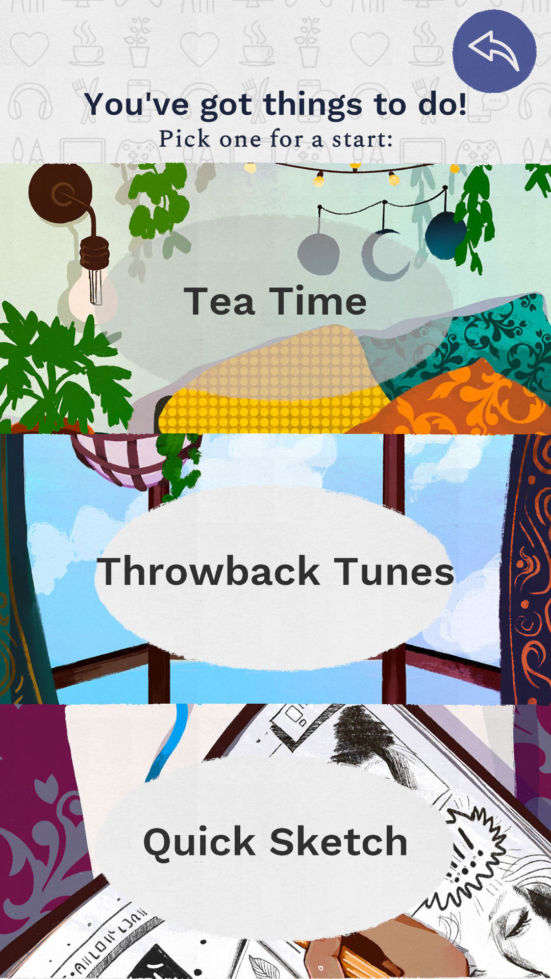 As part of our serious game semester at the Cologne Game Lab, Caro, David and I developed an app that provides you with 3 tasks a day to help you build a structure and distract or occupy yourself with something that is supposed to bring you a bit of joy and self-fullfillment.